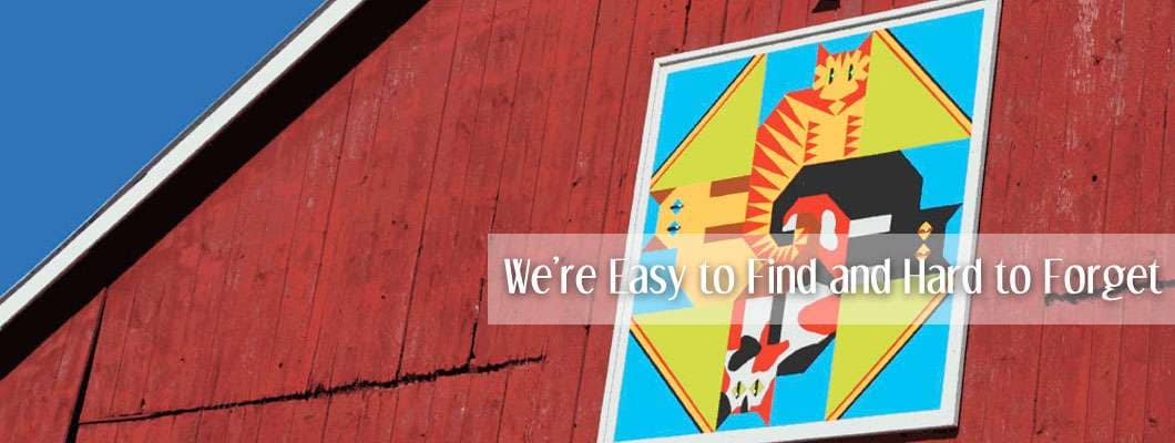 Turn right off the ramp and go one mile to Stevens, the first road on the right at the top of the hill. Watch for the brown “heritage tourism” sign with the right arrow. Turn right. First Farm Inn is one mile ahead on your right. Look for the red barns and white fence. The road dead-ends at the far end of our property line. Park on the asphalt in front of the house, come up on the porch and ring the bell.